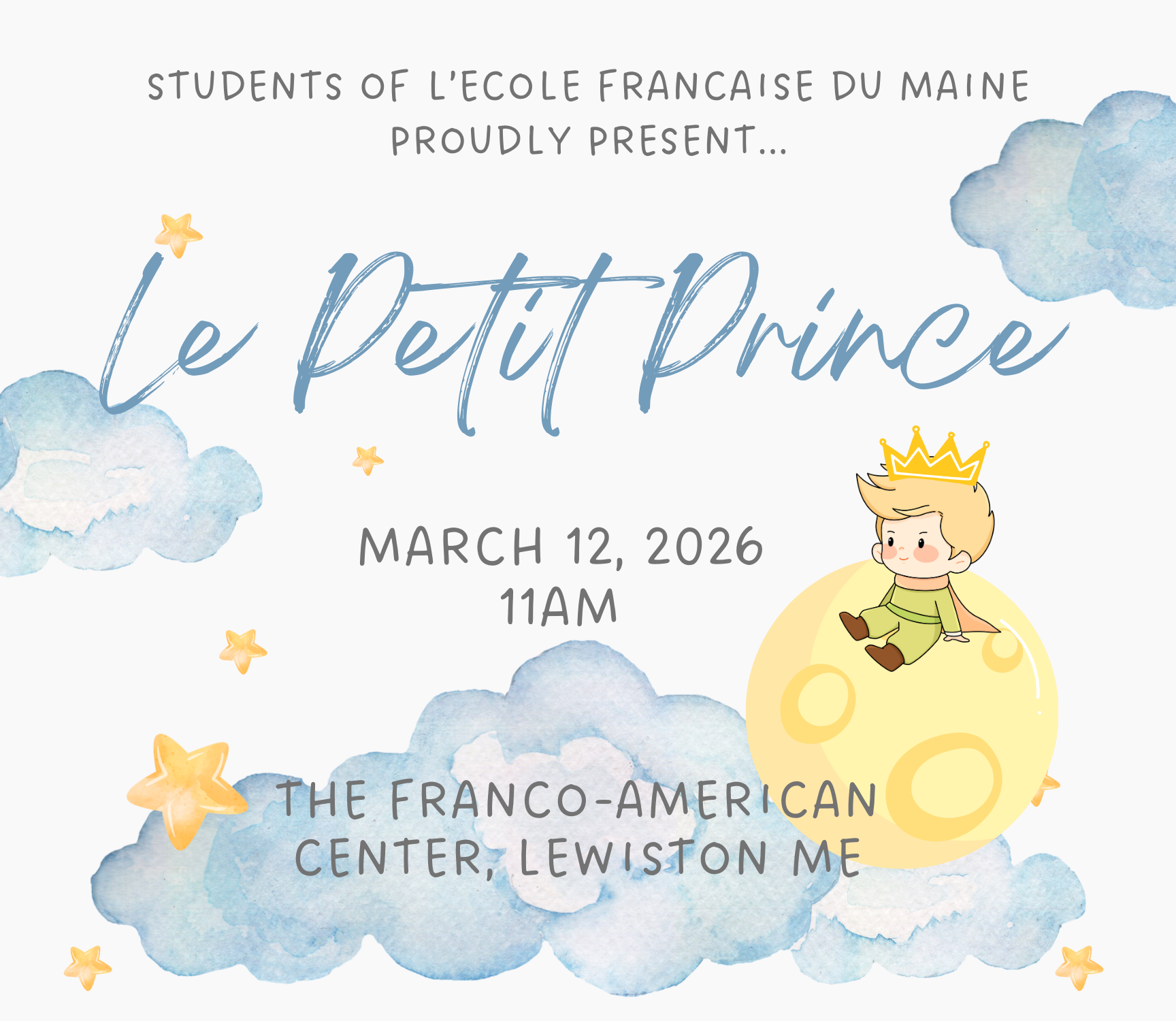 Franco Center 46 Cedar Street, Lewiston, ME, United StatesTHURSDAY, March 12 Doors 10:00am Entertainment 11:00am “Le Petit Prince” musical: The beloved French masterpiece by Antoine de Saint-Exupéry is imagined in a re-telling organized by Jenny LeMaire with live music by Peter Dugas. Through music, dance, and theater, we invite you to explore the wonder of existence and the enduring magic of childhood and friendship… c’est parti! Lunch following the entertainment about 12 to 12:30pm. Details will be finalized: pork roast, rice pilaf, a vegetable, salad, and dessert. https://app.arts-people.com/index.php?show=298063 Students of L’Ecole Française will delight La Rencontre luncheon guests with a lively spring musical “Le Petit Prince” performed in [...]