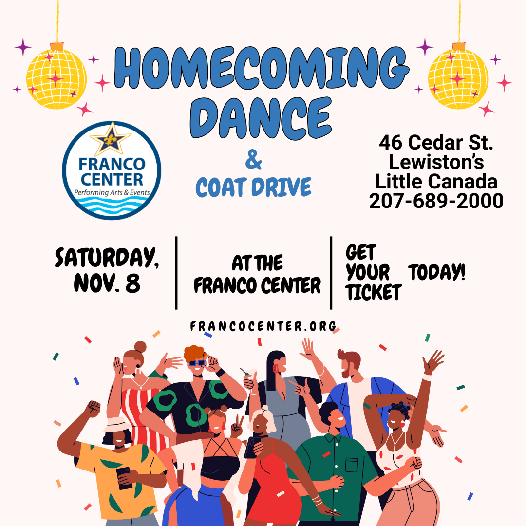 Franco Center Hosts Homecoming Dance and Coat Drive Nov. 8 https://app.arts-people.com/index.php?show=298086 LEWISTON, Maine — The Franco Center will host a festive Homecoming Dance on Friday, Nov. 8, 2025, complete with music, dancing, and a community coat drive. Doors will open at 6 p.m., with a happy hour until 7 p.m., when the dance officially begins. Guests are encouraged to bring new or gently used winter coats to donate. All coats collected will be given to Kaydenz Kitchen, a local nonprofit organization that provides free food and clothing to unhoused individuals and families in need. “Our Homecoming Dance is a chance [...] |