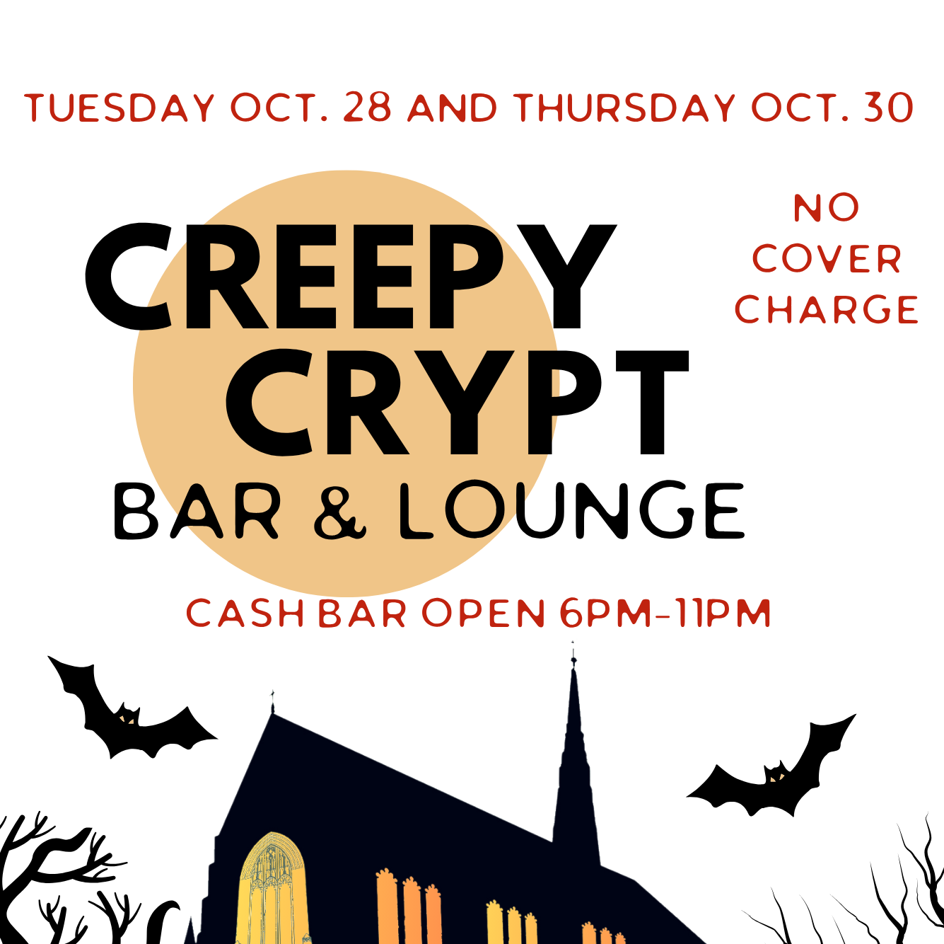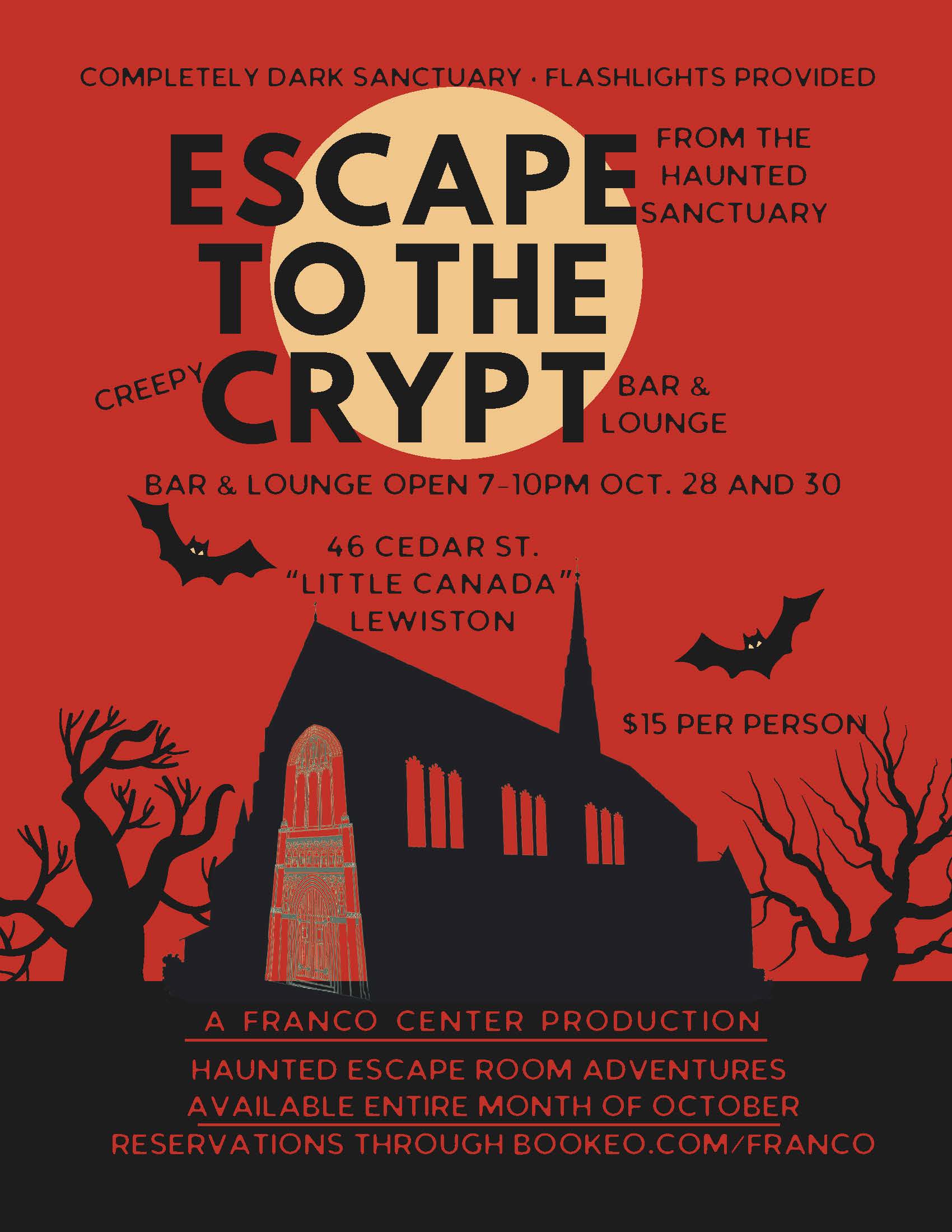 Special Creepy Crypt Bar Nights: NOTE: Tickets are NOT needed for the Bar & Lounge. Experience our brand-new Creepy Crypt Bar & Lounge, open exclusively on: Tuesday, Oct. 28 & Thursday, Oct. 30 from 6:00–11:00 p.m. Specialty drinks will be for sale all night! Enjoy drinks, music, and a chance to mingle in the Franco Center basement (former church crypt). The bar and lounge will be open to the public on those two nights, not just the escape adventurers. This event is a unique opportunity for a fun experience with a Halloween twist—while supporting a local community landmark. Come dressed in [...] |
